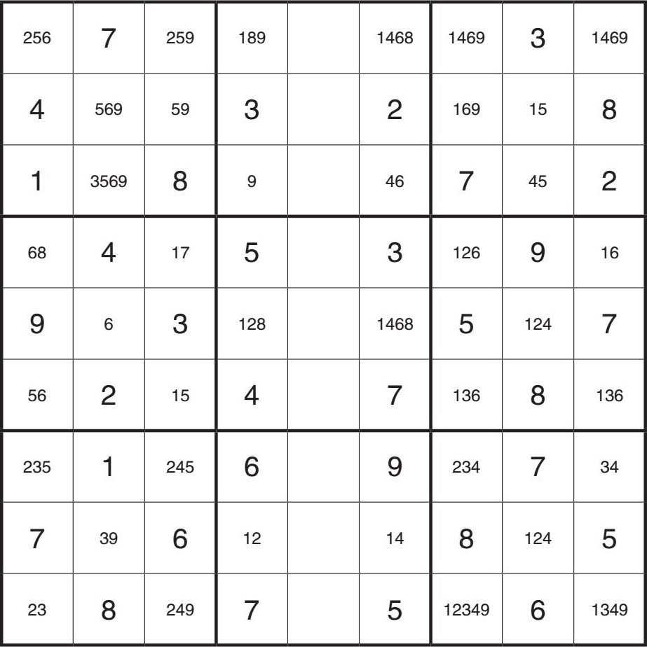这样看来,左上方的小九宫格中第二行中后两个空格都只可能是5和9,那么5和9就不可能出现在其他位置。于是在2,5,9三个候选中确定了2,在2和6中确定了6。对于左下的宫格,中间这列的上方已经有了3,所以3和9的候选就只剩下9了,而(9,3)这个单元格里的9和2也可被删除,确定为4。