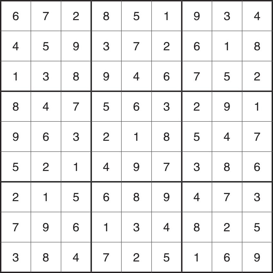 中间的6因为只有一个候选数,所以可以直接确定。而6一旦得以确定,那其他单元格中的候选数6就可以被排除,左上和左下的单元格也随即可以确定数字——8和5。右边两个未知的单元格也可以通过排除候选数5和1来确定最终得数。最终结果为: