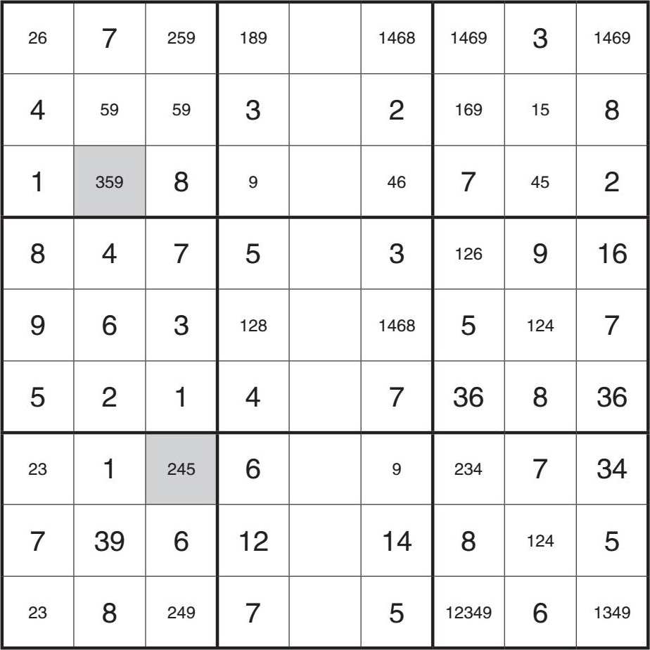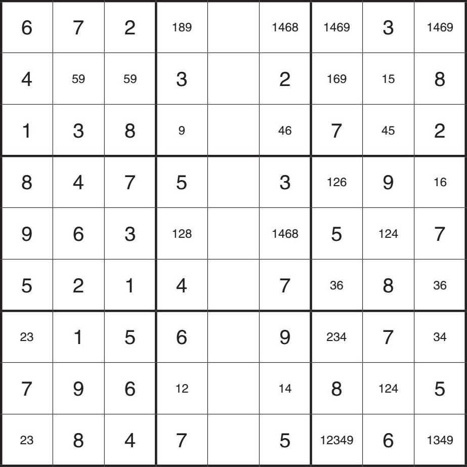 这样看来,左上方的小九宫格中第二行中后两个空格都只可能是5和9,那么5和9就不可能出现在其他位置。于是在2,5,9三个候选中确定了2,在2和6中确定了6。对于左下的宫格,中间这列的上方已经有了3,所以3和9的候选就只剩下9了,而(9,3)这个单元格里的9和2也可被删除,确定为4。