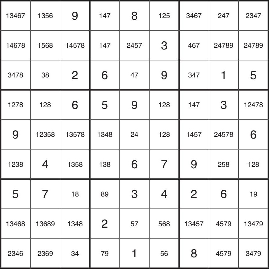 请看上图中的右上九宫格,数字8、9都只出现在(2,8)和(2,9)这两个宫格的候选数中;这时隐性数对删减法的条件已成立了。这表示上右九宫格的数字8和9将只能填到这两个宫格中,而且如果数字8将填入(2,8),那么(2,9)就一定要填入数字9;反之,如果数字9将填入(2,8),那么(2,9)就一定要填入数字8;不论哪一个状况出现,(2,8)和(2,9)这两个宫格的候选数中若还有其他数字,全部是多余无用的,因为这两个宫格若填入数字8、9以外的数字,那么上右九宫格的数字8或9就将无处可填了。候选数的意义是可能填入该宫格的数字,而这两个数字以外的数字已不可能再用来填入本宫格中了,所以可以毫不考虑地把其他宫格内的8和9删减掉。当(2,8)和(2,9)这两个宫格的候选数都安全的删减成数字8、9之后,(2,5)出现了列隐性唯一候选数2,于是可用隐性唯一候选数法来填入下一个解了。