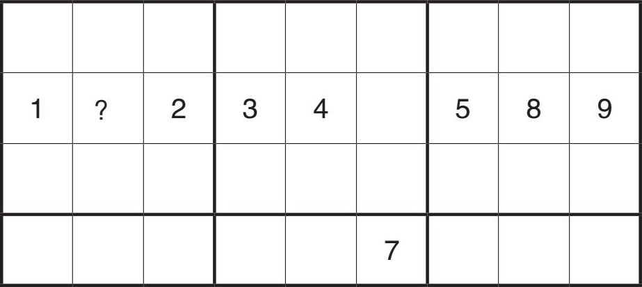 再看看这个范例,左上角第一个九宫格里,哪个格可以填数?通过观察数字1所在的行和列可知,第一个九宫格内的第二行和第二列都不可填入1,因此,1只能填在标记格内。这是通过行列的关系进行排除。