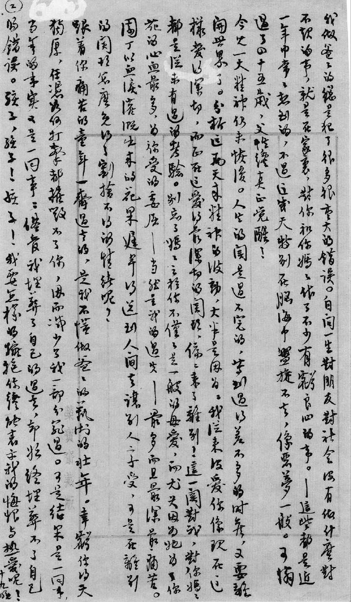 昨夜一上床,又把你的童年温了一遍。可怜的孩子,怎么你的童年会跟我的那么相似呢?我也知道你从小受的挫折对于你今日的成就并非没有帮助;但我做爸爸的总是犯了很多很重大的错误。自问一生对朋友对社会没有做什么对不起的事,就是在家里,对你和你妈妈做了不少有亏良心的事