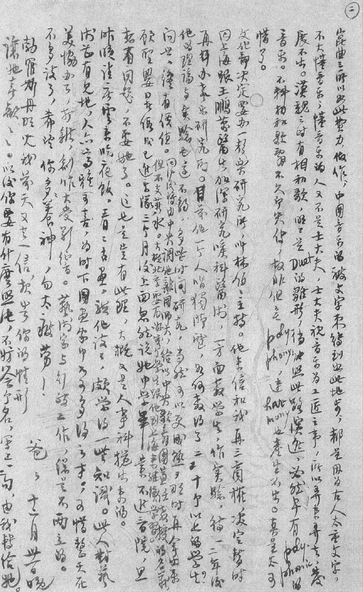你出国去所遭遇的最大困难,大概和我二十六年前的情形差不多,就是对所在国的语言程度太浅。过去我再三再四强调你在京赶学理论,便是为了这个缘故。倘若你对理论有了一个基本概念,那么日后在国外念的时候,不至于语言的困难加上乐理的困难,使你对乐理格外觉得难学。换句话说:理论上先略有门径之后,在国外念起来可以比较方便些。可是你自始至终没有和我提过在京学习理论的情形,连是否已开始亦未提过。我只知道你初到时因罗君患病而搁置,以后如何,虽经我屡次在信中问你,你也没复过一个字。——现在我再和你说一遍:我的意思最好把俄文学习的时间分出一部分,移作学习乐理之用。