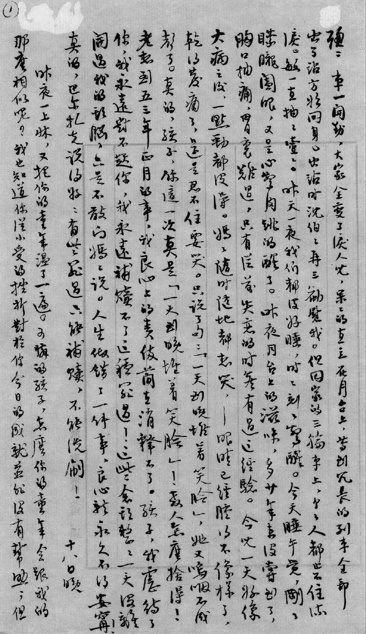 自从接到你三月三日发的信以来,一直没有你的消息,不知你身体好吗。我们多挂念你!爸爸的病还没有好,这回三番四复了几次,寒热停了,隔一天又来了,今天是第三次的高潮,气管发炎了,咳嗽得厉害,发高烧,有些神志不清,病中老在念你,希望你来信安慰安慰他,他是多么企望着疼爱的儿子的信,可是嘴里不讲,知道你忙。就是忙,少写些没关系,只要有你来信,我们是安慰的,高兴的。早晚看信箱,总是没有你的信,孩子!赶快来信吧!