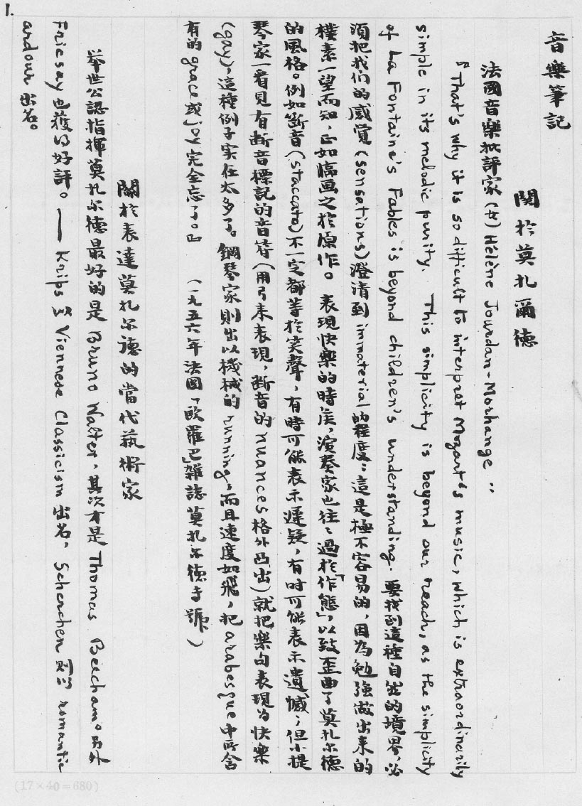 看到国外对你的评论很高兴。你的好几个特点已获得一致的承认和赞许,例如你的tone[音质],你的touch[触键],你对细节的认真与对完美的追求,你的理解与风格,都已受到注意。有人说莫扎特《第二十七钢琴协奏曲》(K595)[(作品五九五号)]第一乐章是healthy[健康],extrovert allegro[外向快板],似乎与你的看法不同,说那一乐章健康,当然没问题,说“外向”(extrovert)恐怕未必。另一批评认为你对K595[作品五九五号]第三乐章的表达“His[他的](指你)sensibility is more passive than creative[敏感性是被动的,而非创造的]”,与我对你的看法也不一样。还有人说你弹萧邦的Ballades[《叙事曲》]和Scherzo[《诙谐曲》]中某些快的段落太快了,以致妨碍了作品的明确性。这位批评家对你三月和十月的两次萧邦都有这个说法,不知实际情形如何?从节目单的乐曲说明和一般的评论看,好像英国人对莫扎特并无特别精到的见解,也许有这种学者或艺术家而并没写文章。