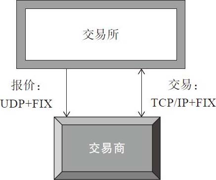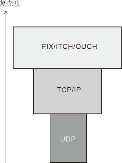 交易信息由三个级别的协议组成,如图2-6所示。最基本的通信级别使得数据流能够进行传输,被称为用户数据报协议(UDP)。UDP是“准系统”(bare bones)数据通信协议,精益实施,并利用最少数量的字节和信息来识别和传递数据流。因此,UDP非常快,但不能保证发送的数据送达。UDP是与用于互联网的在线流游戏(stream games)和流媒体(stream movies)相同的技术,在某处丢失一个数据包并不会显著影响观看者的体验。在交易中,UDP有时用于传输报价、连续刷新的数据,因此不会对丢失的信息非常敏感。如果从交易所发送的特定报价未能到达交易商,则所产生的影响可以被认为是最小的——新的修订报价已经在传输中,在到达交易商的账户时替代丢失的报价。