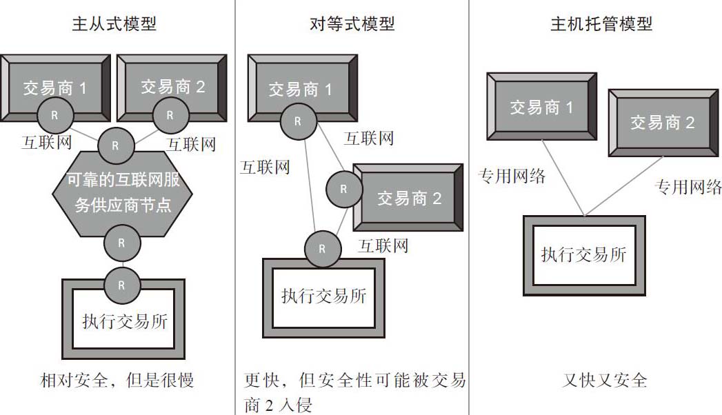 图2-10描述了交易中三种常见的互联网通信模型,包括所谓的主机托管模型。在主机托管模型中,交易商的服务器被安置在与交易所的匹配服务器相同的安全设施中。在主机托管的情况下,交易商的服务器能够使用交易所服务器的专用网络接入。专用网络接入包括从交易服务器直接到交易所的私有安全通信线路,使恶意干预的风险最小化,并且确保所有市场参与者的环境安全。主机托管还提供了如下速度优势:例如,纽约和芝加哥之间的距离较远,此外,主机托管交易连接的安全性节约的巨大成本,可以使在纳斯达克托管主机的芝加哥交易商,在一轮往返下单中,减少17~22毫秒的延迟。图2-11总结了世界各地主机托管中心的延迟时间。
