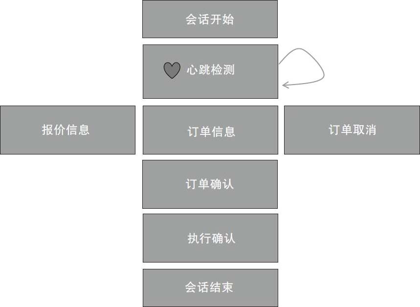 2.心跳检测是一个常用的信息,通知参与者的通信方,参与者在线,且处于良好的技术健康状态,并能开展交易业务。未能在预设的时间段内接收其通信对象的心跳信息的那一方,往往会关闭通信信道。然后可以使用“会话开始”序列来恢复通信信道。
