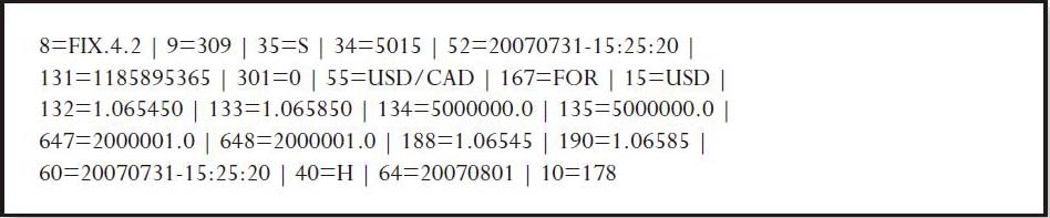 图2-8为一个FIX信息示例,传送美元/加元汇率的报价。显示的报价包含以下信息:
