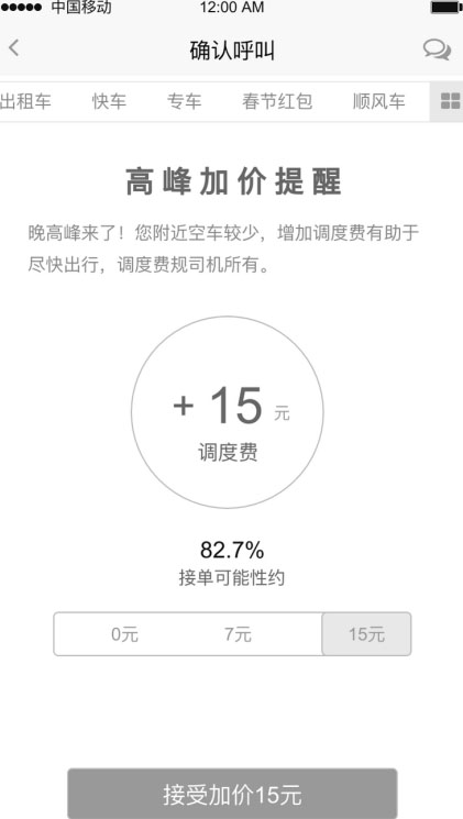 这个界面显示,用户在打开滴滴的时候,界面默认在加价选项上(而且加价还不少),用户可以选择加不同的金额,而平台会告诉用户加不同金额时订单被接的可能性,如果第一次加价订单没有被接,可以调整加价金额再次叫车。