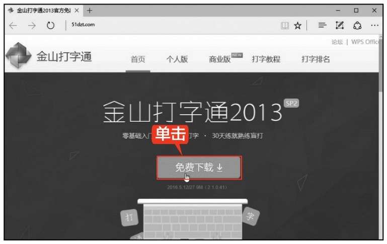 第1步 打开浏览器,输入“金山打字通”的官方网址“www.51dzt.com”,在出现的网站主页中,单击【免费下载】按钮即可。