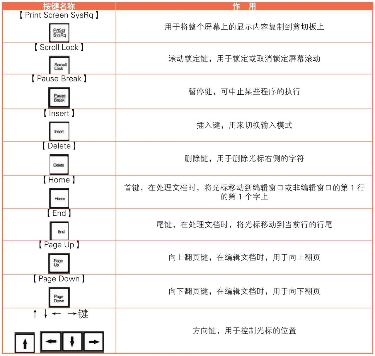 (2)编辑键区。在电脑打字时,编辑键区可以辅助定位光标的位置,按【↑】键可将鼠标光标上移一行,按【↓】键可将鼠标光标下移一行,按【←】键可向左移动一个字符单位,按【→】键可向右移动一个字符单位。
