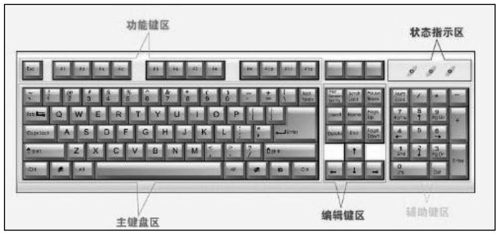 键盘是由常用的101个标准键按钮和3个用于Windows系统的操作键按钮【Wake Up】唤醒按钮、【Sleep】转入睡眠按钮和【Power】电源管理按钮)构成的。键盘分为主键盘区、功能键区、编辑键区、辅助键盘区和状态指示区,外加3个操作键,如下图所示。