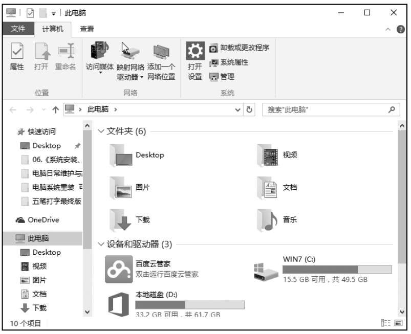 双击:指连续两次快速按下并释放鼠标左键。双击一般用于打开窗口,或启动应用程序。下图所示为双击【此电脑】桌面图标,打开【此电脑】窗口。电脑打字时使用双击操作可以选择鼠标光标所在位置的字符。