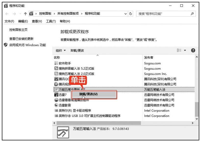第2步 在出现的【程序和功能】对话框,选择要卸载的输入法,单击鼠标右键会出现【卸载/更改】按钮,单击【卸载/更改】按钮即可。