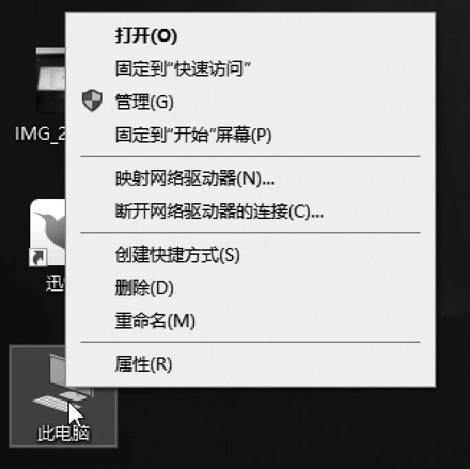 右击:指快速按下并释放鼠标右键。右击一般用于打开一个与操作相关的快捷菜单。下图为右击【此电脑】桌面图标打开快捷菜单的操作。在电脑打字的过程中,一般不使用右击操作,但在设置字体样式等操作时右击可弹出相关快捷菜单。