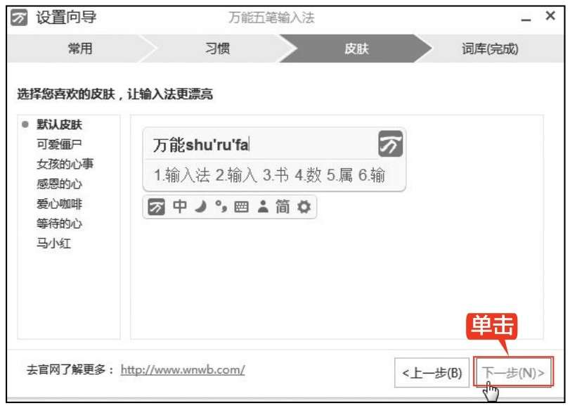 第4步 选择喜欢的皮肤后,单击【下一步】按钮。