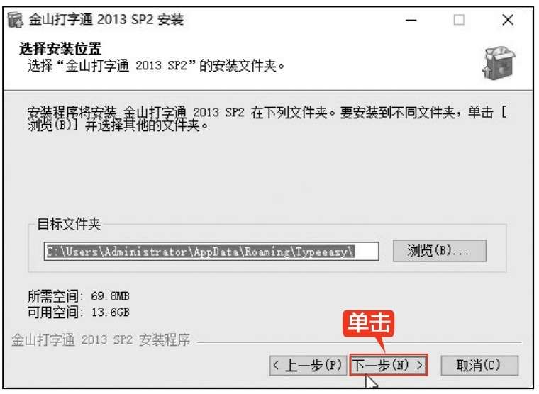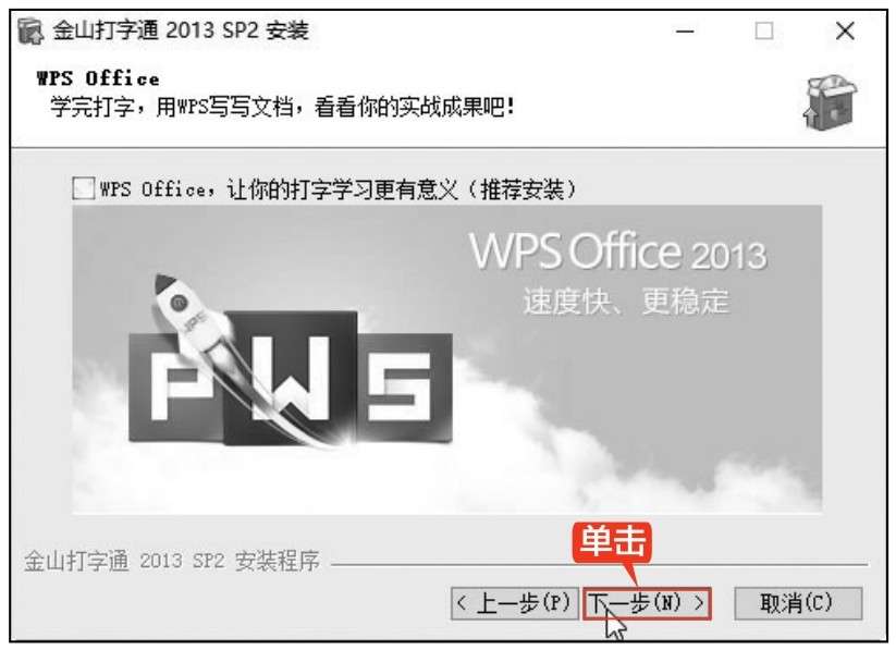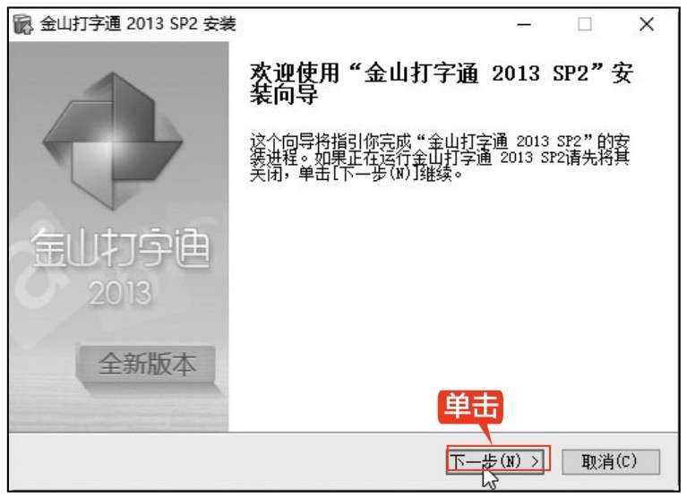 第2步 下载完成后,打开【金山打字通2013 SP2安装】窗口,进入【欢迎使用“金山打字通2013 SP2”安装向导】界面,单击【下一步】即可。