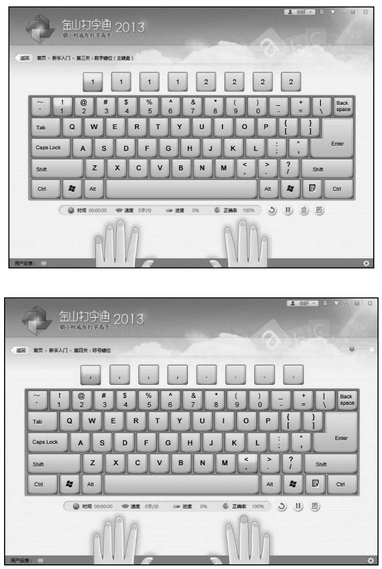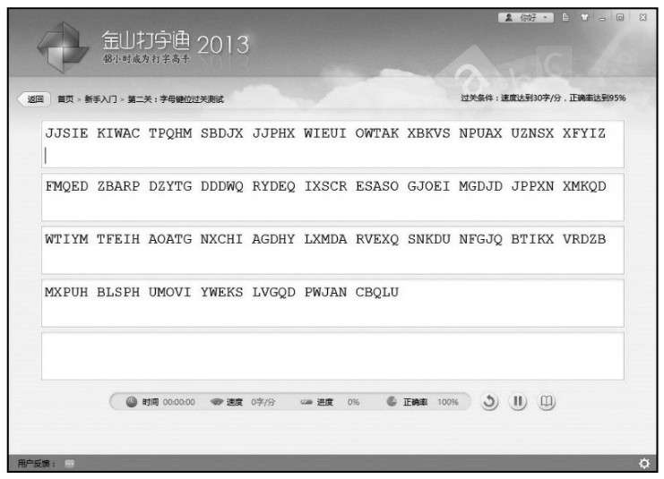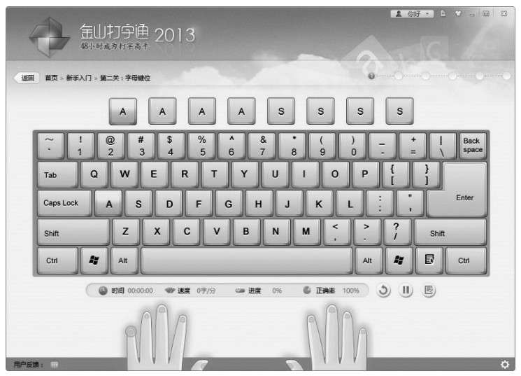 要想快速地熟练使用键盘就需要大量的指法练习,在练习中使用正确的坐姿,运用正确的击键方法。那么让我们通过金山打字2013来练习一下。