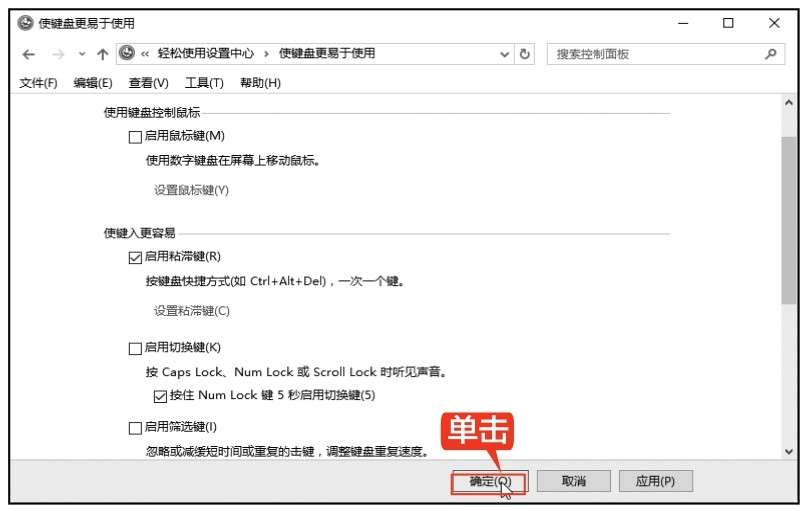 第3步 在出现的页面中,选中【启用粘滞键】复选框,单击【确定】按钮即可启用粘滞键功能。