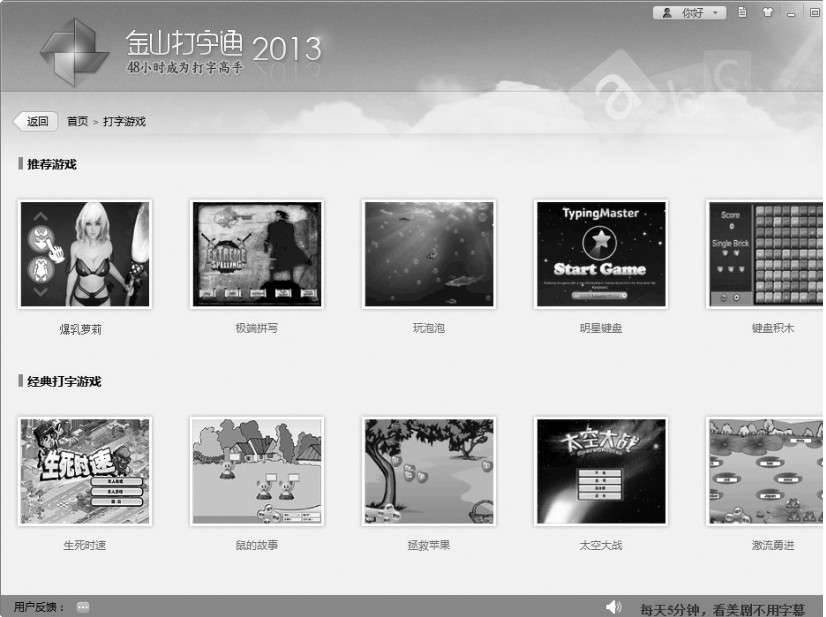 指法练习是一个枯燥、漫长的过程,因此“金山打字通2013”专门设计了多款打字游戏,将指法练习与游戏结合起来,在不知不觉中提高打字速度。