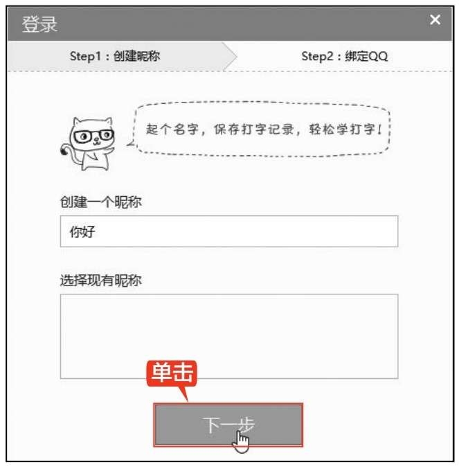 第2步 在出现的【登录】对话框中的“创建一个昵称”文本框中输入昵称,单击【下一步】按钮。