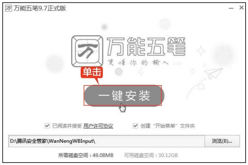 第1步 双击下载的安装文件,即可启动万能五笔输入法的安装向导。单击【一键安装】按钮。