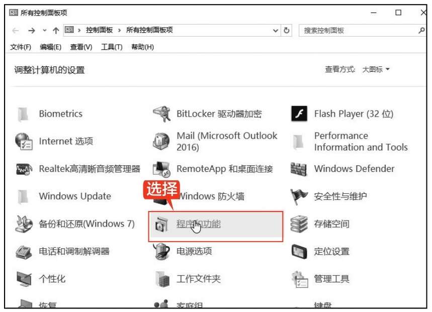 第1步 选择【开始】,单击【控制面板】命令,在打开的【所有控制面板项】窗口,选择【程序和功能】选项。