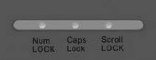 状态指示灯区位于键盘区上方,共有3个指示灯,分别为【Num Lock】数字键盘区的锁定灯、【Caps Lock】大写字母锁定灯和【Scroll Lock】滚屏锁定灯,如下图所示。