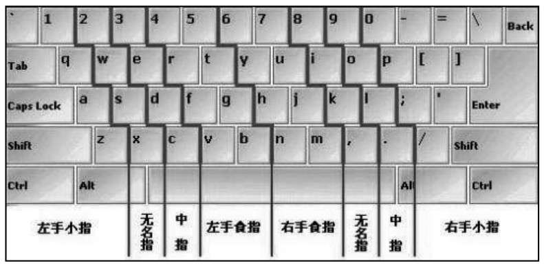 指法就是指按键的手指分工。手指的分工是指手指和键位的搭配,即把键盘上的全部字符合理地分配给十个手指,并且规定每个手指打哪几个字符键。手指负责按键的分配情况如下。