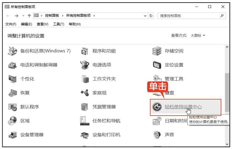 第1步 单击【开始】键,选择【控制面板】选项,单击【轻松使用设置中心】选项即可。
