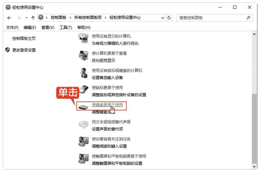 第2步 在出现的【轻松使用设置中心】页面中,单击【使键盘易于使用】。