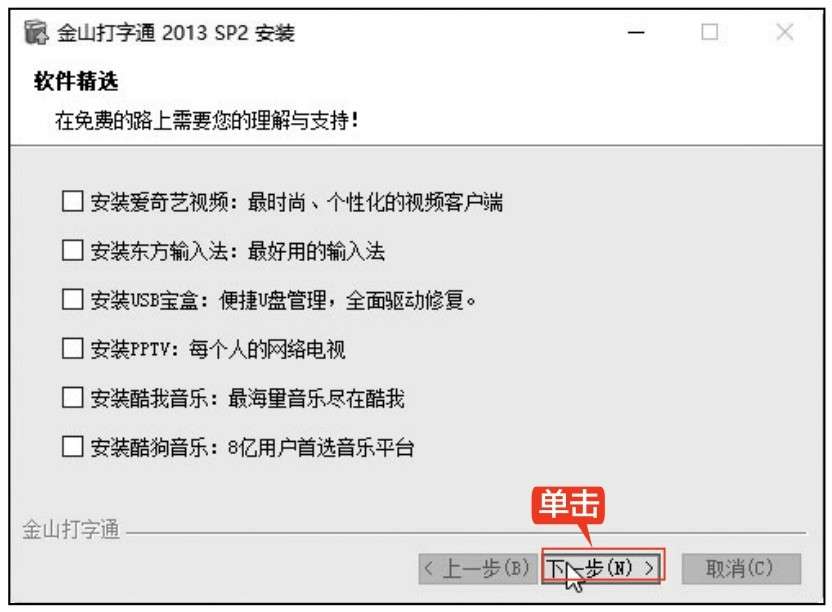 第4步 在进入的【WPS Office】界面中,去除勾选【WPS Office,让你的打字学习更有意义(推荐安装)】选项,单击【下一步】按钮即可。