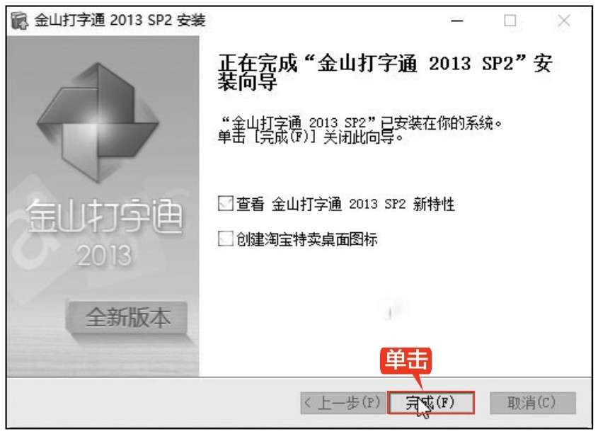 第8步 在打开的【正在完成“金山打字通2013 SP2”安装向导】界面中,取消选中的复选框,单击【完成】按钮,这样就完成了软件的安装。