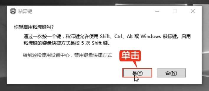 连续按【Shift】键5次可以启动,在出现的【粘滞键】对话框中单击【是】按钮即可启用粘滞键功能。