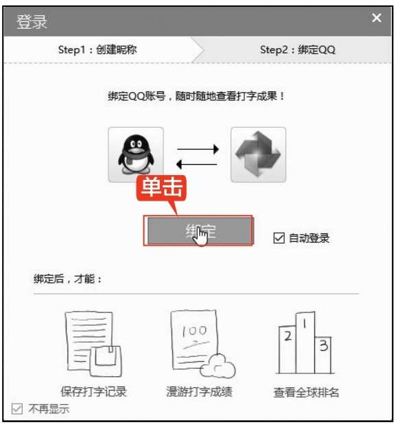 第3步 在【绑定QQ】页面,单击选中【自动登录】和【不再显示】复选框,单击【绑定】按钮,完成绑定。