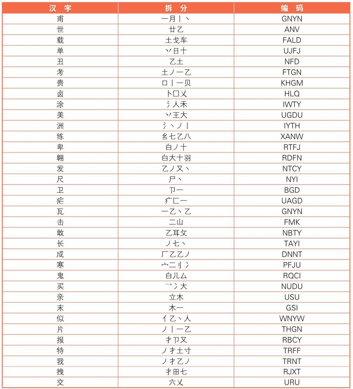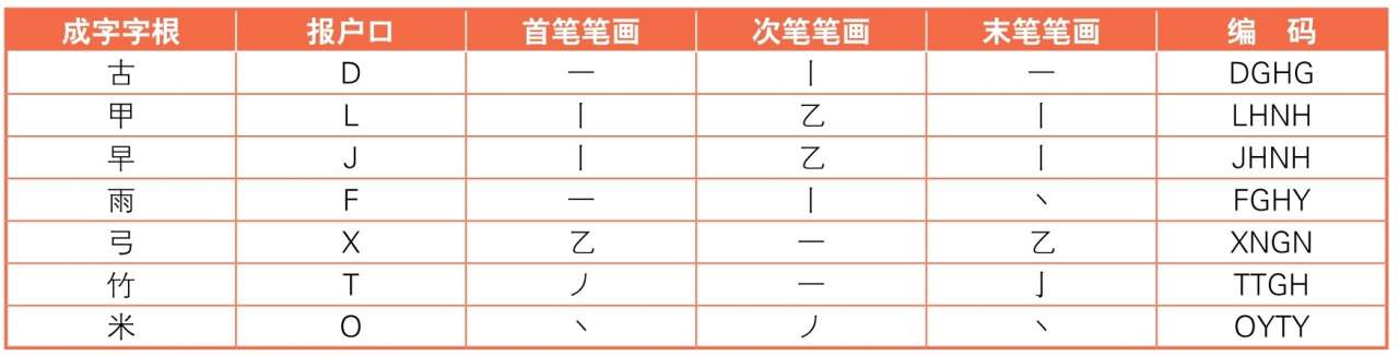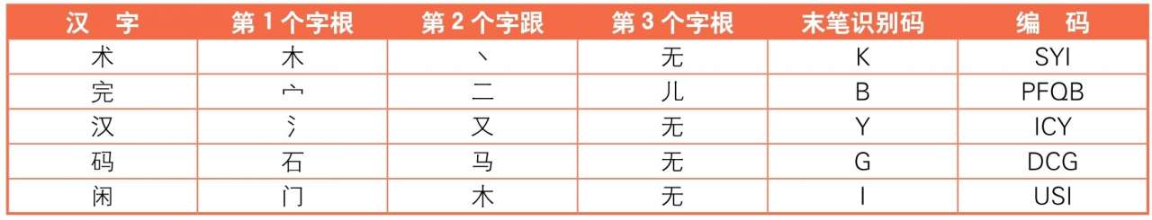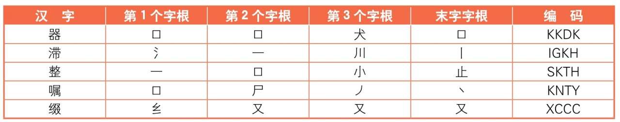 在拆分汉字中,遇到超过4个字根的汉字时,输入的方法是:依次敲击第1个字根所在键、第2个字根所在键、第3个字根所在键和末字字根所在键。看下表来举例说明一下。