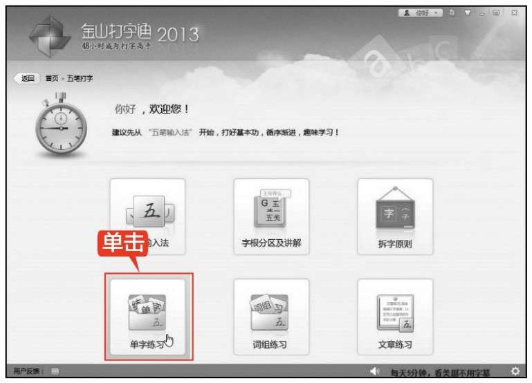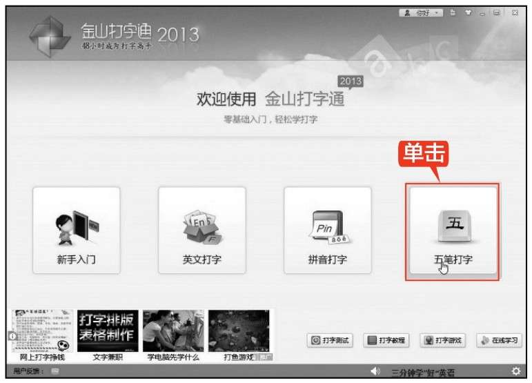 第1步 在桌面上打开金山打字通2013,单击【五笔打字】图形选项。