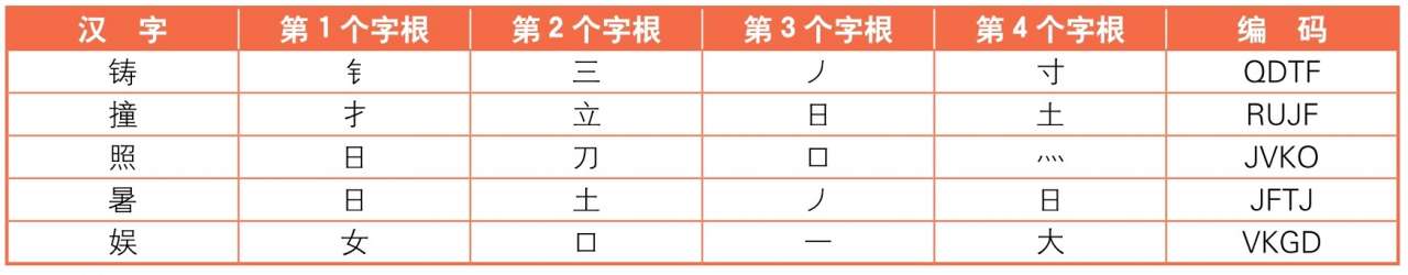 在拆分汉字中,遇到正好4个字根的汉字时,输入的方法是:依次敲击第1个字根所在键、第2个字根所在键、第3个字根所在键和第4个字根所在键。看下表来举例说明一下。