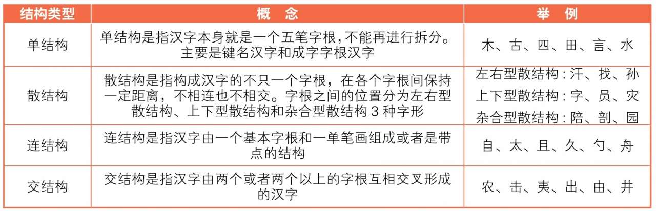 汉字的结构关系也就是构成汉字的字根间的结构关系。总的来说,可以将汉字分为4种结构关系,分别是单结构、散结构、连结构和交结构。