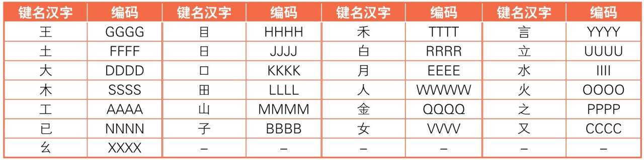 键名汉字共有25个,输入键名汉字的方法是:连续按4次键名汉字所在的字母键。键名汉字的输入见下表。