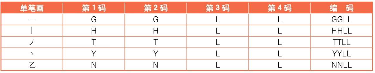 在五笔字型中,有5种单笔画,它们是横(一)、竖(丨)、撇(丿)、捺(丶)和折(乙),分别位于键盘上的【G】【H】【T】【Y】和【N】键上。其输入方法为:连续敲击其所在键位两次,然后再补敲【L】键两次。