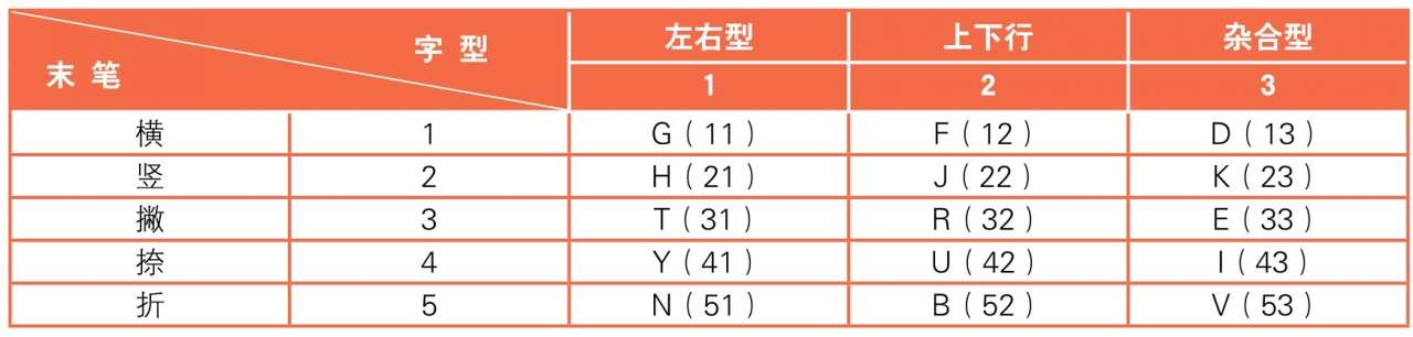 末笔区位识别码是由汉字的末笔笔画代码与字型的代码构成。当拆分不足4个字根的汉字时,依次输入字根所在键位后,补加一个末笔区位识别码;如果补完末笔区位识别码后仍然不足4码,则需敲击空格键。也就是说末笔区位识别码是由两位数字组成的,第1位数字,是末笔笔画的代码,分别为横(1)、竖(2)、撇(3)、捺(4)和折(5),第2位数字,是字形结构的代码,分别为左右型(1)、上下型(2)和杂合型(3)。如“笔”字,末笔笔画是折,区码为5,汉字字型结构是上下型,位码为2,则“笔”的末笔区位识别码为52(B)。