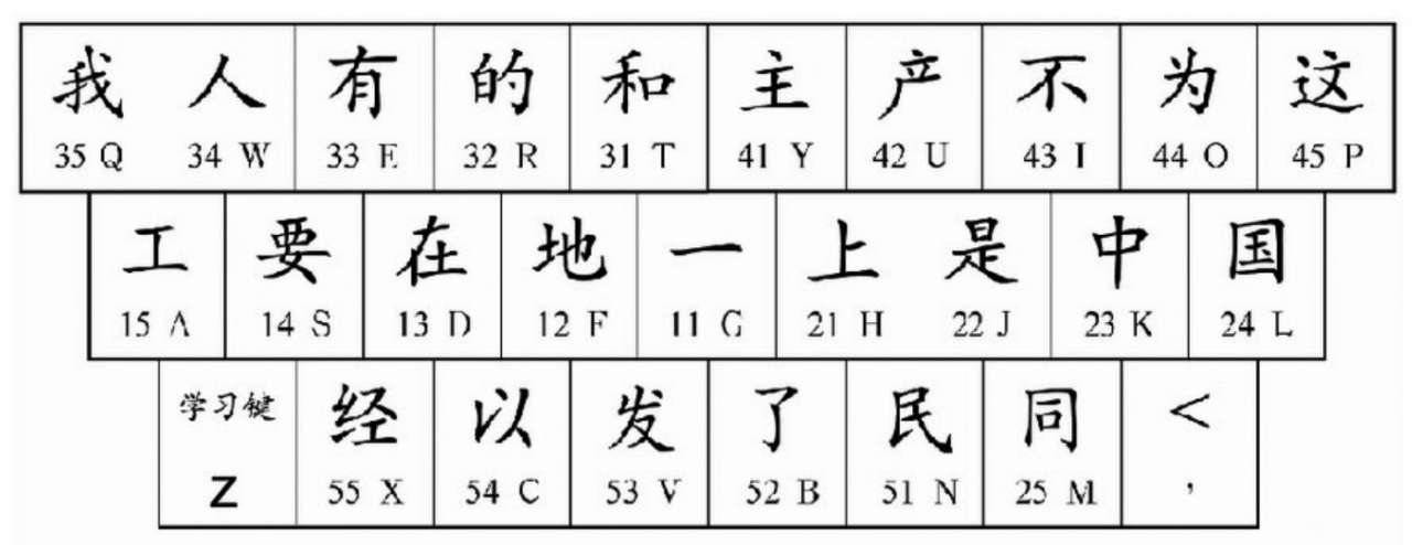 在五笔输入法中将最常用的25个汉字归纳为一级简码,分别位于25个字母键上(除【Z】键外),每个键位对应的汉字,如下图所示。