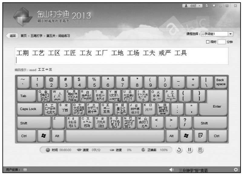 二字词组的输入方法为:分别取每个字的前两个字根,即依次敲击第1个汉字的第1个字根所在键、第1个汉字的第2个字根所在键、第2个汉字的第1个字根所在键和第2个汉字的第2个字根所在键。下面举例说明二字词组的输入方法。