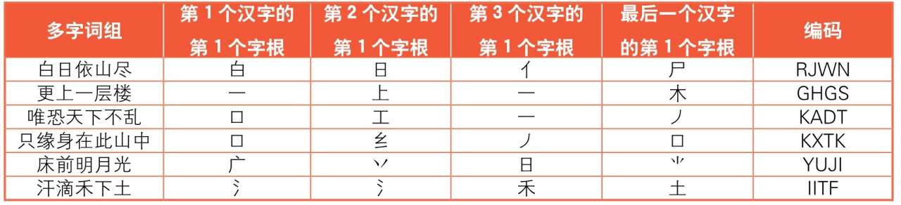 多字词组的输入方法为:分别取第1、第2、第3和最后一个字的第1个字根,即依次敲击第1个汉字的第1个字根所在键、第2个汉字的第1个字根所在键、第3个汉字的第1个字根所在键和最后一个汉字的第1个字根所在键。下面举例说明多字词组的输入方法。