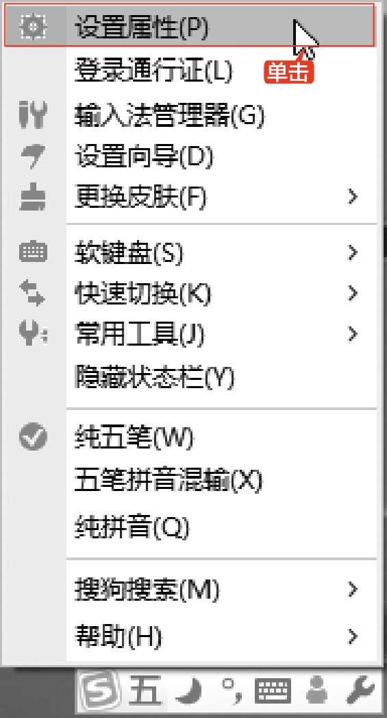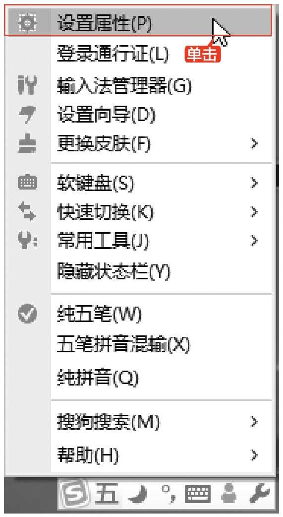 第1步 在搜狗五笔输入法状态条上单击【菜单】,在出现的界面上单击【设置属性】按钮。