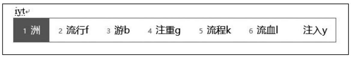 例如,“洲”字,依次敲击【I】【Y】和【T】键,再补击空格键即可,如下图所示。