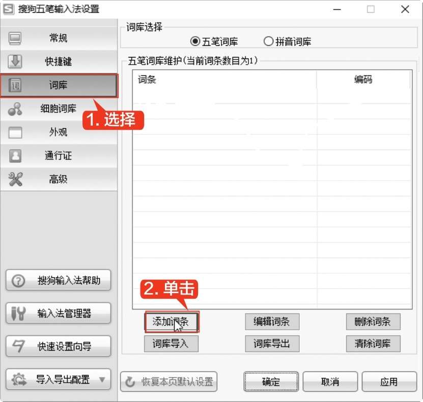 第2步 在弹出的【搜狗五笔输入法设置】页面中,选择【词库】选项,接着单击【添加词条】按钮。