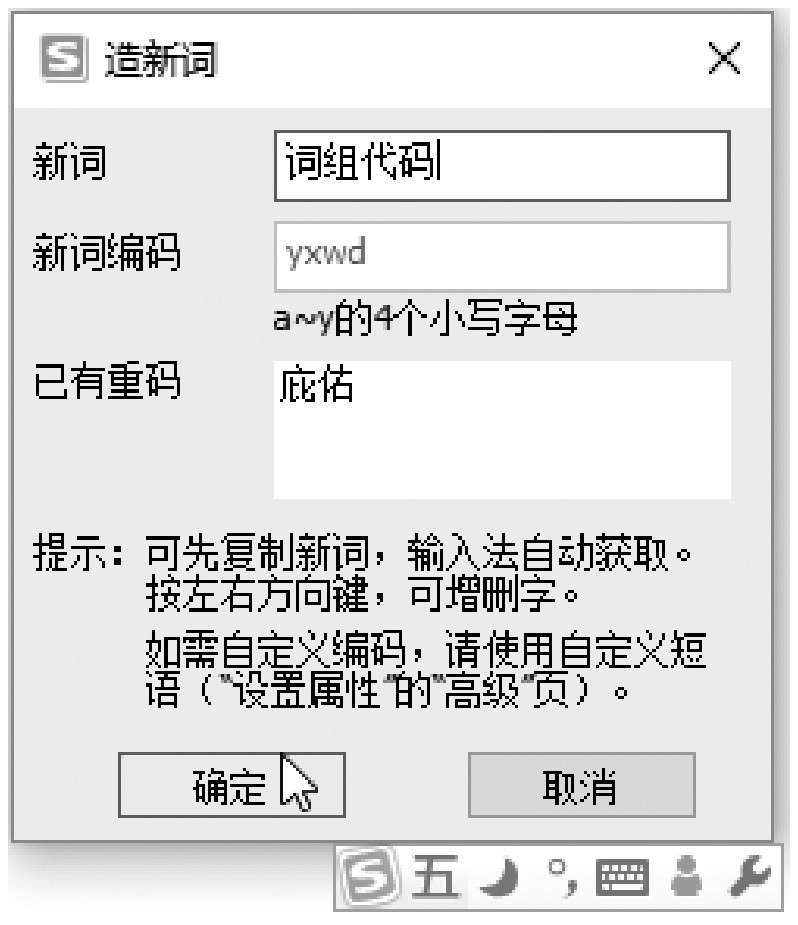 第3步 在【新词】文本框中输入新词组,【编码】文本框中会自动加上新的编码;若有重码,在【已有重码】文本框中会显示已有重码词条。添加完成后,单击【确定】按钮即可。